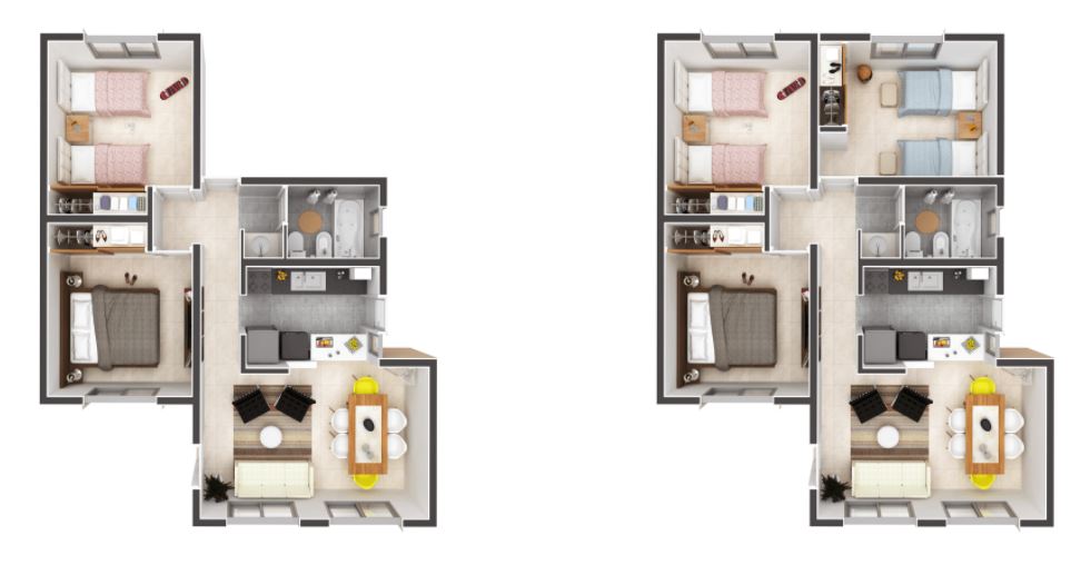 De líneas rectas y óptima distribución de los ambientes, esta tipología responde a las tendencias de la arquitectura minimalista. Su diseño integra muy bien el living y la cocina, permitiendo planificar espacios de vida confortables y prácticos.