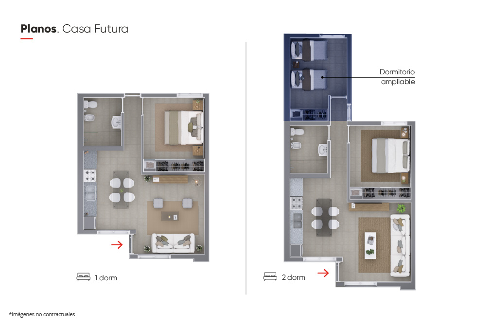 La Tipología Futura es nuestro modelo evolutivo, una vivienda de construcción tradicional sobre lotes en P.H. (Planta Horizontal), con una estructura preparada para realizar modificaciones en planta baja y ampliar hacia toda una segunda planta.