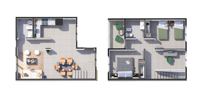 Nuestros dúplex son edificaciones de dos pisos que te ofrecen espacios más amplios, más luminosos y más cómodos, lo que te permite disfrutar mejor de cada ambiente.